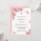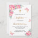 Um fundo branco decorado com flores e borboletas cor-de-rosa. Personalize e o nome e os detalhes da cerimônia. Letras pretas e ouros coloridas. Traseira: cor de fundo embaçada.