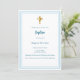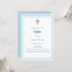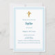 Um fundo branco, decorado com um quadro azul claro, e um ouro cruza Personalize e adicione o nome e os detalhes. Texto branco.