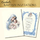 Apresentando um belo convite de Natal batismo, feito por um costume, com uma fronteira decorativa azul e uma imagem vintage da Bênçatez Maria e Jesus. Todos os textos e fontes podem ser modificados.