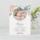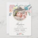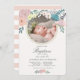 Este convite para o batismo de uma garota elegante e fofa apresenta um fundo creme com sua foto e flores de primavera em rosa, branco e azul. O verso apresenta um fundo branco com listras em cor-de-rosa pincelado. Personalize-o para as suas necessidades. Você pode encontrar produtos correspondentes na minha loja.