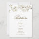 Um convite de batismo ou baptizado elegante que apresenta delicadas flores brancas enquadrando os detalhes do seu batismo ou baptizado em tipografia dourada elegante. Concebido por Thisisnotme©