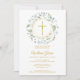 Uma grinalda de louro decorativa, anéis dourados e cruz ficam acima das informações do convite de batizado ou cerimônia especial neste design elegante.