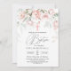 Convite Floral para Batismo. Este design apresenta uma ilustração de rosas cor-de-rosa pálidas e caules verdes folha em estilo aquarela. Na parte superior do cartão há uma imagem de Cross.