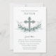 Este convite ao batismo moderno apresenta uma elegante cruz azul, folhas de aquarela e botões de flores, ideal para a ocasião especial do seu filho. Produtos CORRESPONDENTES disponíveis em nossa loja.