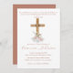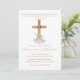 Este elegante convite de batismo personalizado floral apresenta uma imagem de aquarela religiosa no centro. Uma cruz de madeira é acentuada com flores brancas e cor-de-rosa, e verde delicado. Por cima da cruz de madeira, é impresso um verso de bíblia para batismo.