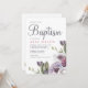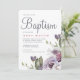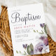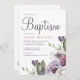 O convite para o batismo de uma menina floral de primavera púrpura bonito apresenta um belo buquê de flores roxas pastel no canto do convite, com batismo escrito em letras grandes e elegantes. Este clássico convite à aquarela é perfeito para um sacramento católico do batismo, do batismo cristão, ou para ocasiões religiosas cristãs.