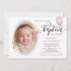 Convite de batismo com sua foto em uma linda moldura oval com detalhes florais. Design apresenta ouro rosa falso "Batismo" em uma escrita de estilo escrita à mão e banner com cruz. Basta adicionar seu texto com os modelos fornecidos.