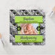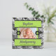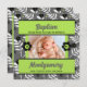 Sombras brilhantes de par verde com cinzas, branco e preto em um padrão floral retrô para criar uma bela maneira de os pais convidarem família e amigos para o Batismo de seu lindo bebê ou garota.