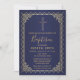 Convidado Baptismo Dourado e marinho. Design, recursos de vintage gold frame e cruz em um fundo de marinho. Clique em personalizar para editar fonte/ cor/ estilo ou mover texto etc.