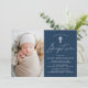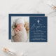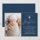 Os simples convites para batismo apresentam um roteiro casual de caligrafia branca com um fundo azul marinho para um design perfeito para um batismo moderno para bebês. Personalize os convites elegantes do batismo com a foto, o nome e os detalhes do evento religioso do seu filho. A parte de trás do convite para o batismo de fotos de marinho proporciona espaço para texto e fotos adicionais.