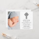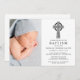Um convite elegante ao batismo, com a fotografia do seu filho ou filha, uma ilustração de uma cruz celta e uma simples tipografia moderna.