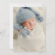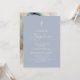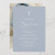 Um simples convite ao Batismo moderno apresenta um cartão azul empoeirado com tipografia branca para personalizar com os seus principais detalhes, incluindo o nome, data, hora e local do batismo, recepção e informações de RSVP. O verso apresenta uma foto do seu bebê