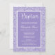 Uma cor damasco de classe aparece neste convite elegante para o batismo. Mostrado em roxo e branco.