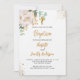 Para o batismo de 2 duas crianças. Um fundo branco decorado com folhagens de eucalipto, uma rosa branca e folhas douradas e gotas de glitter dourado falso. Personalize os nomes das crianças e detalhes da cerimônia. Letras pretas e douradas. Gênero neutro.