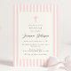 Convite luxuoso e elegante para o batismo para raparigas que apresente rosas claro e listras brancas e uma cruz simples num fundo de marfim. Para uma aparência texturizada premium, escolha o tipo de papel "Laid".