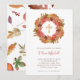 Este convite para o Batismo de outono apresenta uma coroa na moda constituída por folhas vermelhas, marrons e de queda de ouro e um padrão de folhas de outono coordenado no verso. Há uma cruz de ouro falsa no centro deste cartão neutro de gênero.