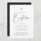 Convide convidados para comemorar o batismo do seu pequeno com estes convites modernos e mínimos em preto e branco clássico. Simples design apresenta "batismo em escrita manual casual, com a sua cerimônia e detalhes de celebração em letras negras modernas e suaves. Uma pequena ilustração cruzada moderna completa a design.