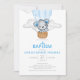 Blue Bear Hot Air Balloon Boy Baptism Convite com urso azul giro em um balão azul de ar quente.