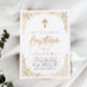 Um convite para o batismo de ouro botânico moderno e elegante. Design apresenta elegante quadro botânico dourado, cruz dourada, guião manuscrita ''Baptism'' e detalhes de celebração em letras negras de tenda maiúscula.