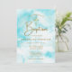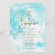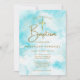 Convite para batismo elegante, minimalista e moderno, com fundo azul de aquarela, falsa cruz de folha de ouro e manchas de ouro com letra simples e moderna.