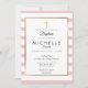 Batismo feminino elegante ou batizante convite listrado, cor-de-rosa-bebê e branco, com uma elegante cruz de ouro com uma falsa borda de folha de ouro armando seus detalhes especiais para comemoração, definidos em tipografia clássica chic. Projetado por Thisnotme©