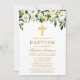 O Convite para Batismo Dourado e Floral Branco da Elegante Watercolor inclui flores brancas, peões e verde botânico.