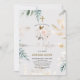 Design de cartão elegante, com cor de água rosa, flor escamoteada, folhas verdes, rosas e folhas em relevo, uma cruz falsa de ouro, uma caligrafia moderna de "batismo", sobre fundo quic com folhas verdes e douradas. Use a ferramenta Personalizar para adicionar suas informações. Para encontrar itens, por favor, visite minha Coleção Elegante de Christening Baptism.