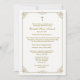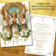 Esta ilustração religiosa elegante apresenta três anjos cerebrais com ouros e asas brancas por baixo de um ouro ao estilo gótico ornamentado cortados com uma cruz. O anjo central tem um livro de orações aberto com um pingente de cruz, enquanto os anjos flanqueantes têm as mãos unidas em oração. Todos os três visto elaboram vestimentos brancos e dourados com sotaques verdes. No fundo, lírios brancos puros de Páscoa com folhas verdes vibrantes enquadram a cena, simbolizando ressurreição, pureza e nova vida. O fundo do céu azul suave cria uma atmosfera celestial, fazer desta imagem católica tradicional perfeita para anúncios batismos e celebrações de uma nova vida na fé.