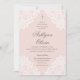 Um convite elegante para o batismo, com cantos brancos de renda suaves em um fundo cor-de-rosa pincelado.