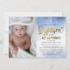 Ouro a aquarela moderna Convite para Batismo e primeiro aniversario com uma fotografia, fundo azul de aquarela e confete dourado, Batismo e script de primeiro aniversario em letras de tendências e detalhes.