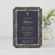 Convites elegantes de batismo floral, azul e dourado, com dentro de cor dourada, numa armação verde.