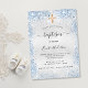 Um batismo moderno e elegante, celebrando um menino. Fundo de aspecto fino prateado decorado com poeira azul brilhante e uma cruz de ouro. Personalize e adicione um nome e detalhes da parte. Letras pretas coloridas.