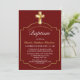 Celebre o batismo do seu amado bebê com a família e amigos, enviando-lhes este elegante convite batismo de burgundy e de ouro. Esta design apresenta uma bela cruz ouro com uma armação de ouro contra um fundo burgundy simples e elegante. Personalize o texto e a fonte ao seu gosto que inclui o nome do seu filho, a localização do batismo, as suas informações de recepção e as suas informações de RSVP.