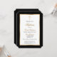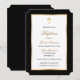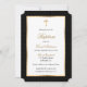 Convite para batismo negro e dourado elegante com um padrão de bolinhas. A folha de ouro só é simulada no trabalho de arte.
