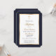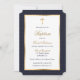 Convite para batismo de ouro e azul elegante com um padrão de bolinhas. A folha de ouro só é simulada no trabalho de arte.