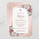 O convite para o batismo de uma garota floral Elegante rosa dourado com um confete rosa dourado e um quadro adornada com rosas cor-de-rosa pinceladas e verde definindo os detalhes do evento. Personalizar facilmente online.