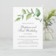 Batismo russo e convite para o primeiro aniversário com um simples design com uma aquarela verde pintada com folhas grandes, sobre fundo branco. Abaixo estão os detalhes de seu evento em uma cinza macia e a parte traseira tem uma lavagem com aquarela verde-clara. Esta elegante design botânica é neutra em termos de gênero e funciona para um rapaz ou uma rapariga.