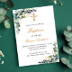 Um fundo branco decorado com verde de eucalipto e folhas de ouro e ouro. Personalize e o nome e os detalhes da cerimônia. Letras pretas e ouros coloridas. Verso: cor azul clara do fundo.