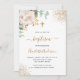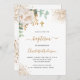 Um fundo branco decorado com verde de eucalipto, uma rosa branca, folhas de ouro e falsas gotas de ouro. Personalize e o nome e os detalhes da cerimônia. Letras pretas e ouros coloridas. Sexo neutro. Traseira: fundo branco com quedas de brilho de falso ouro