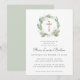 Um convite para o batismo moderno, personalizável, com um delicado lírio do design floral do vale em torno de uma cruz de impressão de ouro ornamentado, sobre um fundo limpo e com uma elegante inscrição.