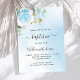 Um céu azul como fundo decorado com eucalipto verde, um rosa azul claro e folhas de ouro. Personalize e o nome e os detalhes da cerimônia. Letras pretas e ouros coloridas.