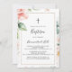 Este convite para o batismo floral de folhagem verde de ouro geométrico é perfeito para um batismo ou batizante moderno. O design apresenta uma folhagem botânica, pintada à mão, verde e dourada, com flores cor-de-rosa, pinceladas, brancas, enfeitando uma elegante estrutura geométrica.