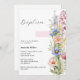 Um fundo branco, com uma grande cruz rosa decorada com flores rosa e azuis. Personalize e adicione o nome e os detalhes.