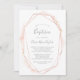 Este convite de batismo geométrico por rosa dourado é perfeito para um elegante batismo bebê. A design de whimsical apresenta uma cor-de-água cor-de-rosa pincelada neutra com lindas formas geométricas de folha de rosa de ouro falsas e brilhando.