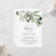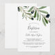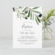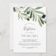 Este moderno convite para batismo de ramo de oliveira é perfeito para um batismo de bebê boho. O design rústico, porém elegante, apresenta folhas verdes botânicas de aquarela simples e azeitonas pretas em um pequeno galho com um toque clássico mediterrâneo.