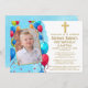 Este belo convite de primeiro aniversário também serve para convidar seus hóspedes para o batismo do seu garotinho. O primeiro aniversário apresenta uma fotografia do seu filho num fundo de aquarela azul com bolinhas brancas e balões coloridos. Do lado batismo está o texto dourado com a missa e os detalhes da festa em ouro, assim como uma cruz de ouro sobre o confete azul de aquarela. Fotografia © Storytree Studios, Stanford, CA