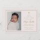 Este Convite para Batismo de Foto Dourado Cruzado Elegante Clássico apresenta um simples quadro de brilho dourado e cruz, nome de script, foto vertical e texto limpo e editável por chic. Clique no botão editar para personalizar este design.