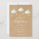 Perfeito por convidar amigos e família para um batismo especial. Apresentando nuvens cor-de-rosa giras e estrelas ouros em cordas, num fundo kraft rústico. Adicione seus detalhes de celebração em branco para criar o convite perfeito de sexo neutro.