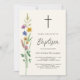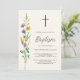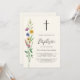 Este convite floral do Batismo floral rústico é decorado com flores silvestres e uma cruz num fundo de creme mole. Facilmente personalizável. Original Watercolor © Michele Davies.