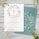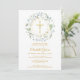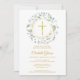 Uma coroa de louros decorativa, anéis dourados e cruz estão acima das informações do convite de batizado ou cerimônia especial neste desenho elegante.